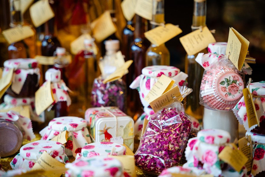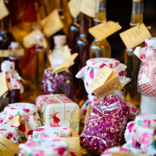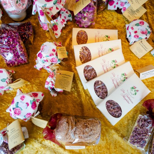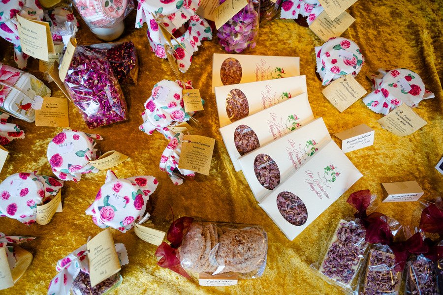 Ergänzt wird dieses Angebot mit feinen Kräuterrapsölen und Kräuteressigen, Confiserie sowie unser Rosenkochbuch und Textiles für die Rosenküche.