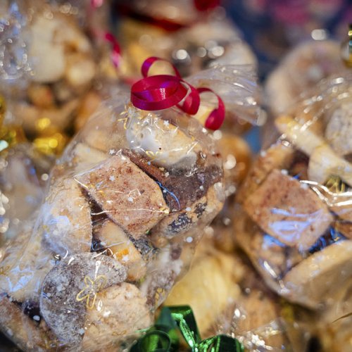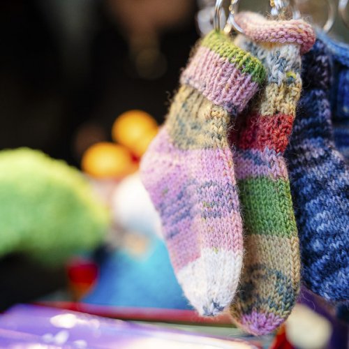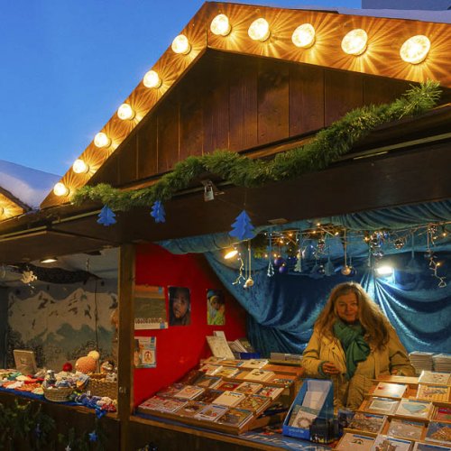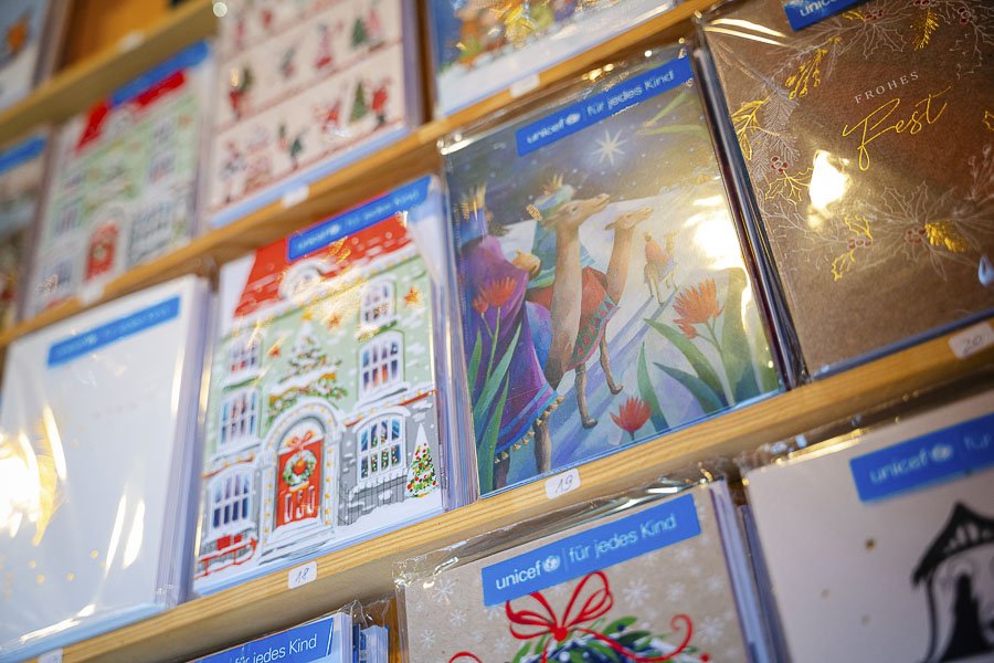 Im anderen Teilstand werden kreativ gestaltete Weihnachtsgrußkarten von UNICEF zum Verkauf angeboten.