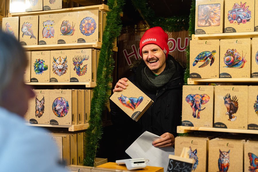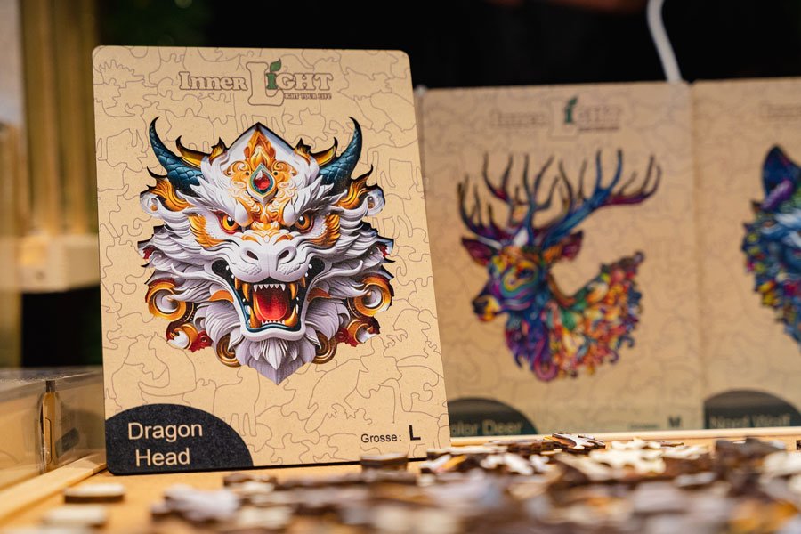 Am Stand von Weihnachtspuzzlezauber erwarten Sie außergewöhnliche Holzpuzzle, die nicht nur spielerisch herausfordern, sondern auch mit ihren kunstvollen Motiven begeistern. Die hochwertigen Puzzleteile aus Holz liegen angenehm in der Hand und ergeben farbenprächtige Bilder – von mystischen Drachen bis hin zu detailreichen Tiermotiven.